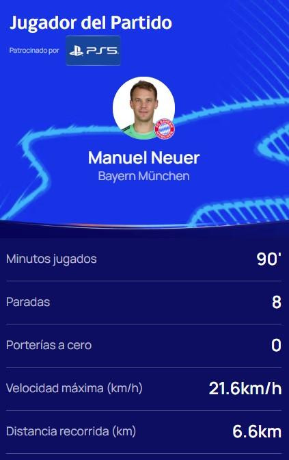 欧冠官方宣布,本场贡献8次扑救的诺伊尔当选全场比赛最佳球员。