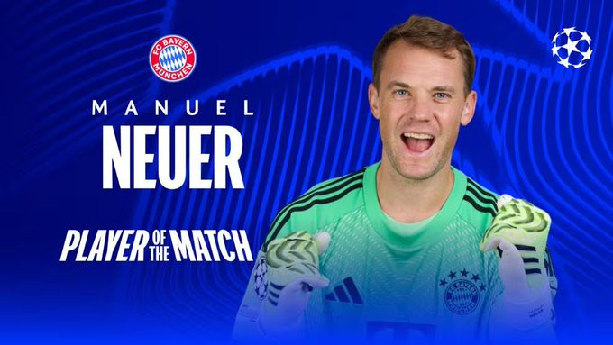 > 欧冠官方: 诺伊尔当选拜仁2-1巴黎圣日耳曼全场最佳球员